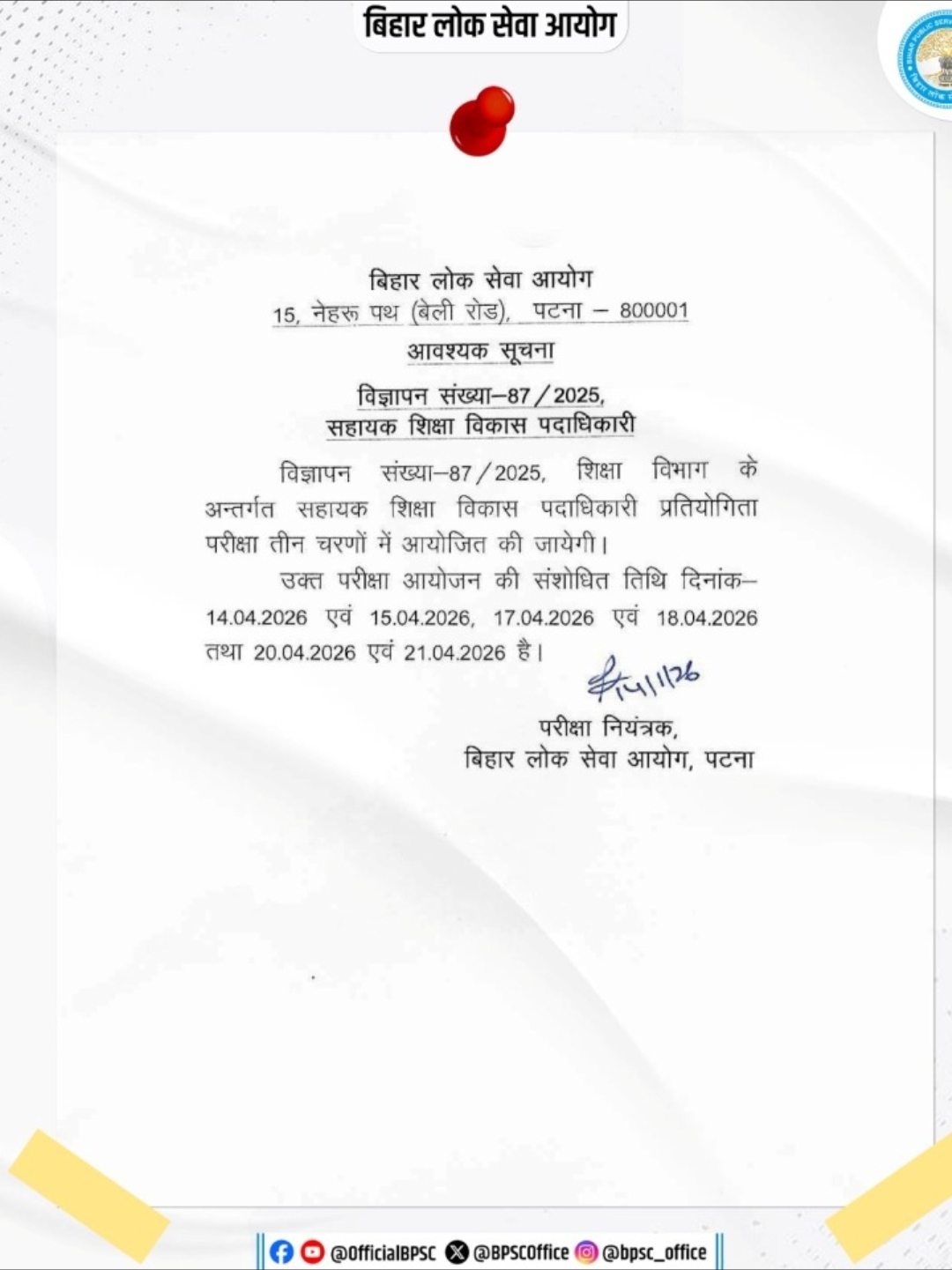 | Bihar Public Service Commission (BPSC) Assistant Education Development Officer (AEDO)Advt.No. – 87/2025 Exam Date Out 2026.Short Details of NotificationWWW.OFSSRESULT.COM |